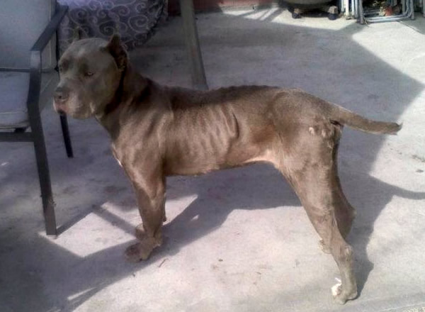“Found several days ago with choke markings on neck, ears and legs have gashes as if he were used as dog bait…As you can see in the photo, he is severely malnourished. He was given vitamins and food. He is slowly but surely coming back to life, and responds so well to all this attention. He ate and ate and ate…until the cows came home!! :))”